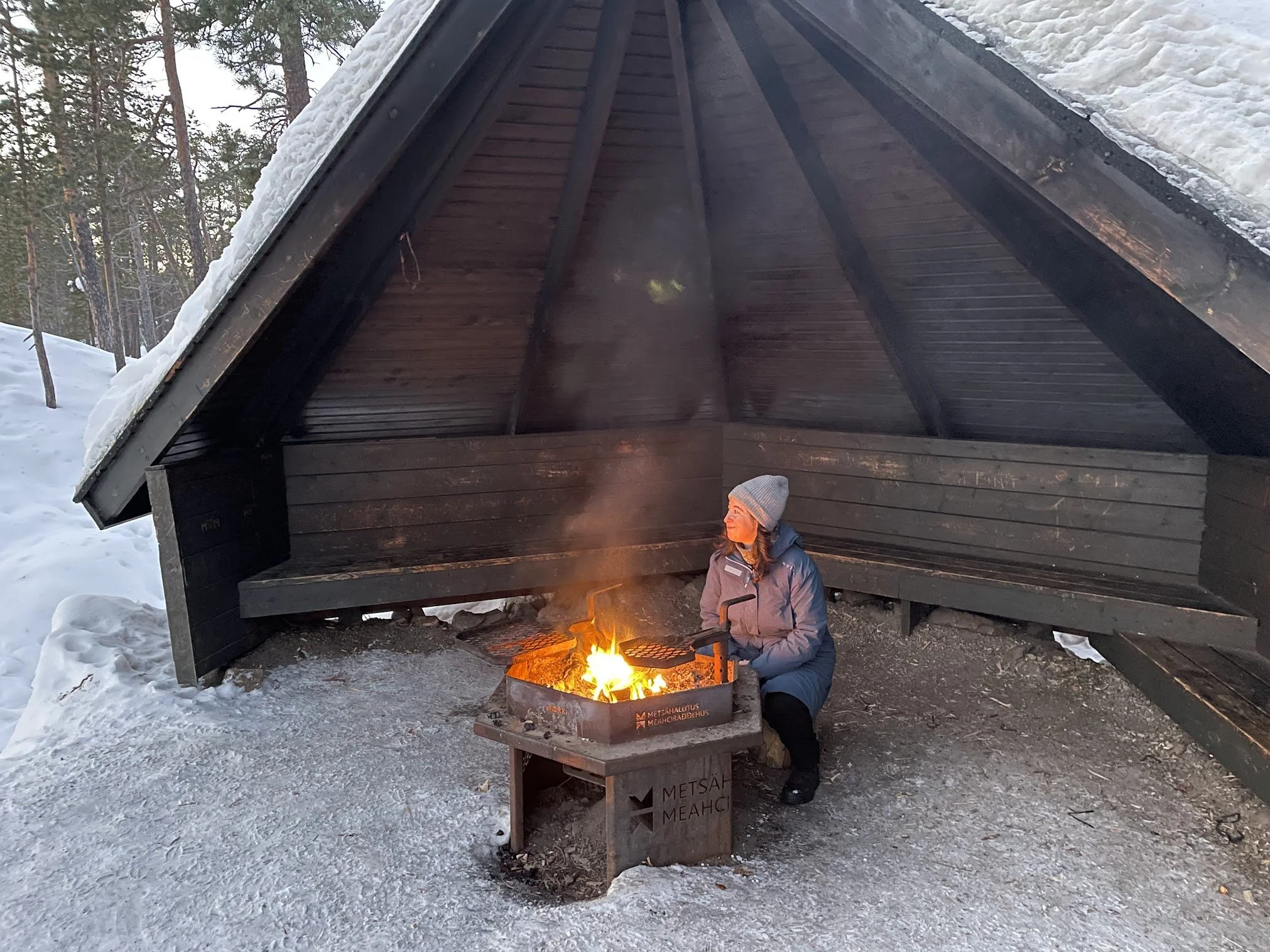 When we arrived at our destination—the Jäniskoski suspension bridge, suspended over the rapids of Juutuajoki river, I was enthralled by what lay on the other side: at the apex of the five-kilometer hiking loop, set away from a small outhouse with a composting toilet, was a three-sided laavu. Laavut, similar to tipis, are traditional temporary homes used by the Sámi, the indigenous people of Scandinavia, who now reside primarily in northern Norway and Finnish Lapland. Laavut are slightly wider and squatter than tipis, making them more stable in high winds, and were designed to be easy to construct and deconstruct as Sámi reindeer herders moved across the land. The modern shelter I saw before me, which looked like a pointy-topped yurt with its front chopped off, housed a bench and a fire pit which, to my delight, had a fire burning, presumably lit by some previous hikers or perhaps some park employees.